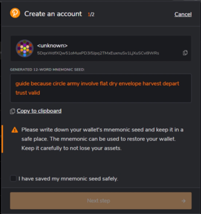 6. Tick the checkbox “I have saved my mnemonic seed safely” and click the “Next step” button to see this view: